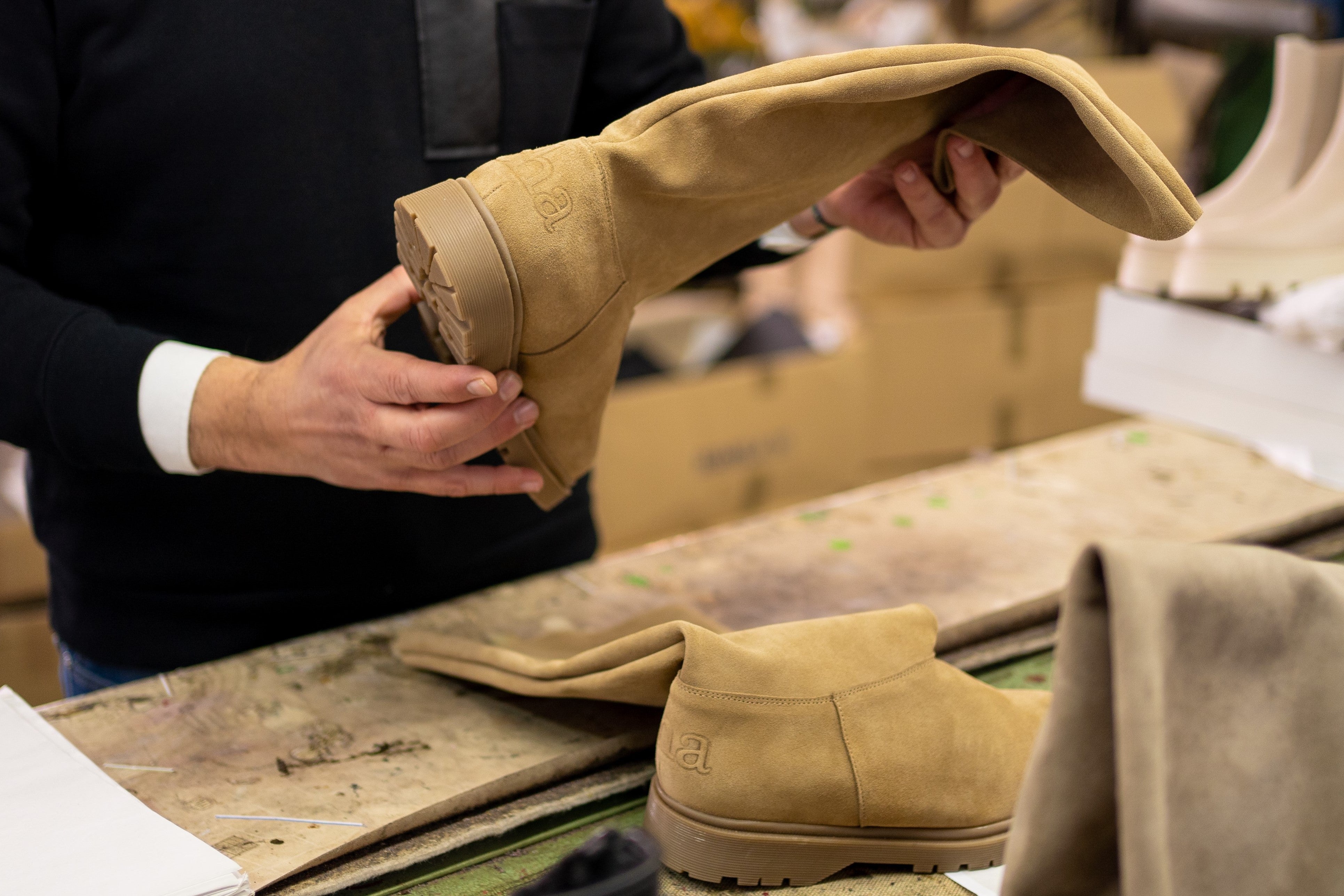 CHA boots are lined with soft 100% pecora merino wool produced in Toscany. All our merino sheep were sheared painlessly and are still enjoying the outdoors as we speak! They have to be shaved otherwise they overheat. Their high quality wool is cleaned with sustainable products. After cleaning it will be woven in a unique way on textile. Now our interior is ready to be stitched onto leather. CHA Shoes maintains a very strong heel and nose throughout what makes us so remarkable! Once that foot clicks in most women are hooked! :)